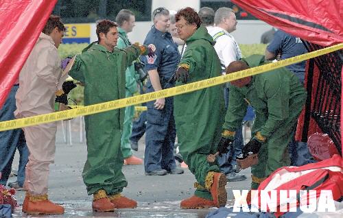 在美國佛羅里達州的杰克遜維爾市,從發(fā)生爆炸的尤尼森工業(yè)公司走出的救援人員接受輻射檢查
